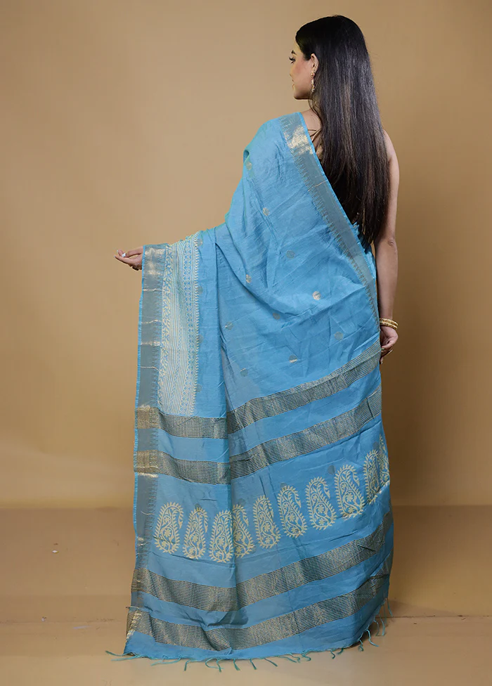 Elegance is when the inside is as beautiful as the outside Presenting, this blue color chanderi saree, made with blended cotton fabric which will give you a comfortable yet attractive look. The best part of this saree is its printed. Comes with a matching blouse piece. Add some matching accessories to complete your look.