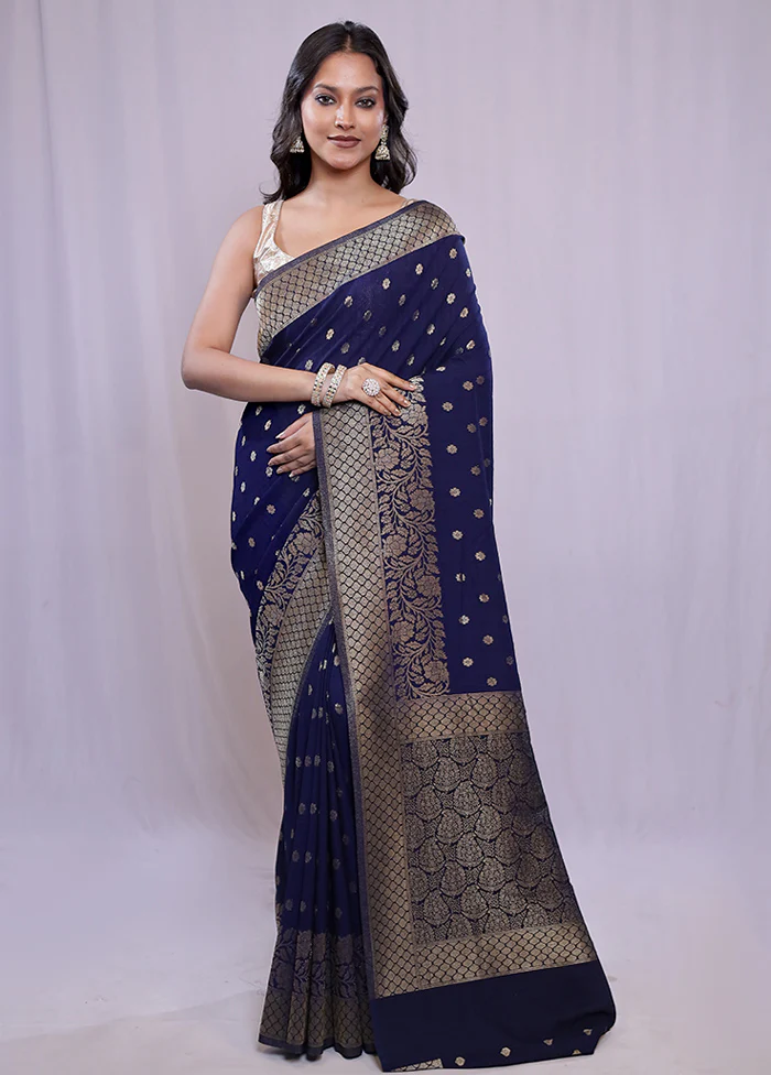 Where elegance weaves itself into tradition, and every fold tells a story of grace and beauty. Presenting, this blue color georgette saree, made with blended georgette fabric which will give you a comfortable yet attractive look. The best part of this saree is its butta work with zari border and pallu. Comes with a matching blouse piece. Add some matching accessories to complete your look.