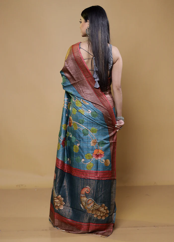 Blue Handloom Tussar Pure Silk Saree With Blouse Piece