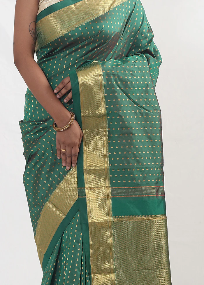 A beautiful saree is undoubtedly a head-turner. Presenting, this green color kanjivaram saree, made with blended silk fabric which will give you a comfortable yet attractive look. The best part of this saree is its butta work with zari border and pallu. Comes with a matching blouse piece. Add some matching accessories to complete your look.