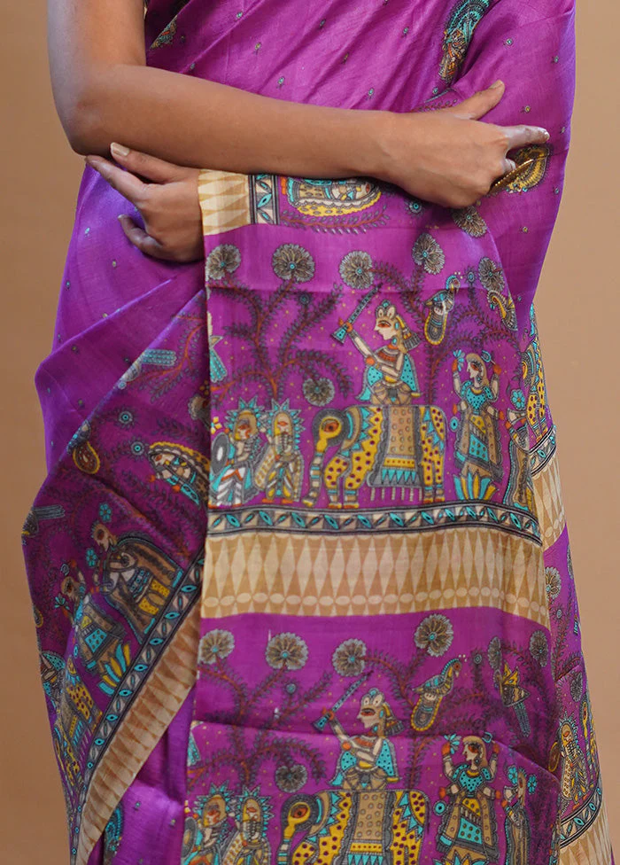 Purple Printed Pure Silk Saree Without Blouse Piece