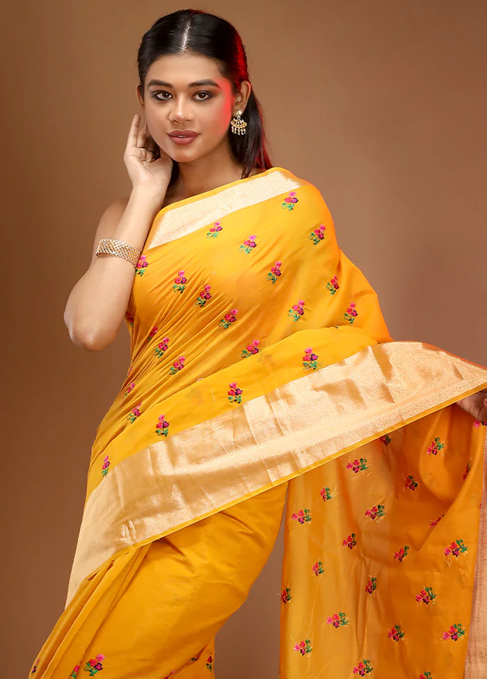 This beautiful saree in yellow is ornated with floral motifs embroidered all across the saree and gives a lightweight drape. This blended cotton saree comes with a complimenting blouse piece. You can style this saree with a contrasting blouse as well and do not forget to add a statement jewellery.